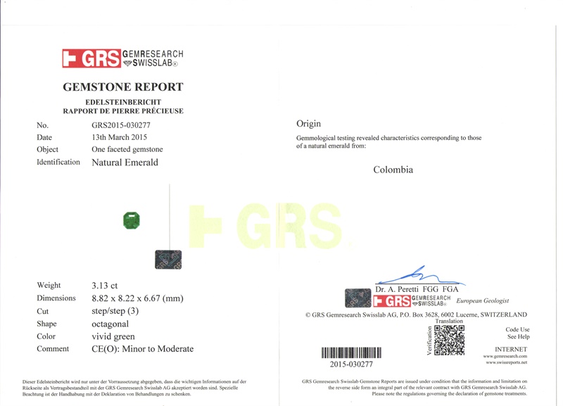 哥伦比亚 祖母绿裸石3.13克拉 GRS vivid Minor to Moderate