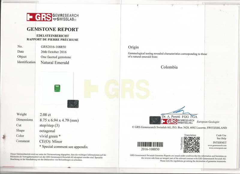哥伦比亚 祖母绿裸石2.08克拉 GRS VIVID MUZO Minor
