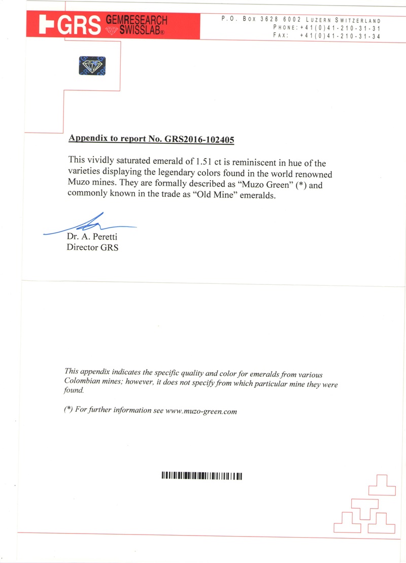 祖母绿裸石 GRS木佐绿 几乎无油 1.51克拉 vivid muzo insignificant