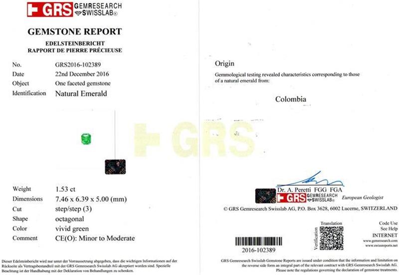 哥伦比亚 祖母绿裸石1.53ct GRS vivid green minor to moderate