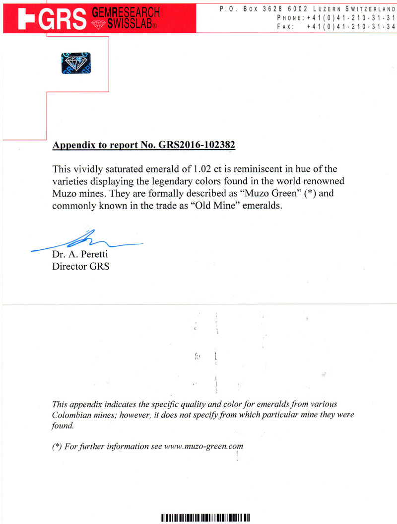 哥伦比亚 祖母绿裸石1.02ct GRS vivid muzo minor to moderate