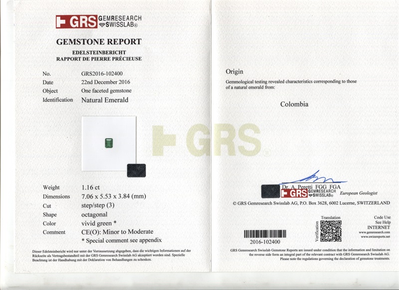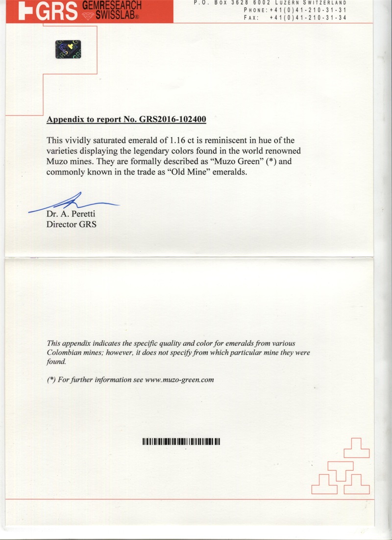 哥伦比亚 祖母绿裸石1.16ct GRS vivid muzo minor to moderate
