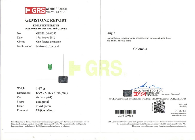 哥伦比亚 祖母绿裸石1.67克拉 GRS vivid Minor